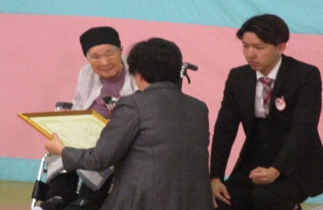 食事後は敬老会を行いました。写真のお二人は、今年100歳を迎えられた方々。