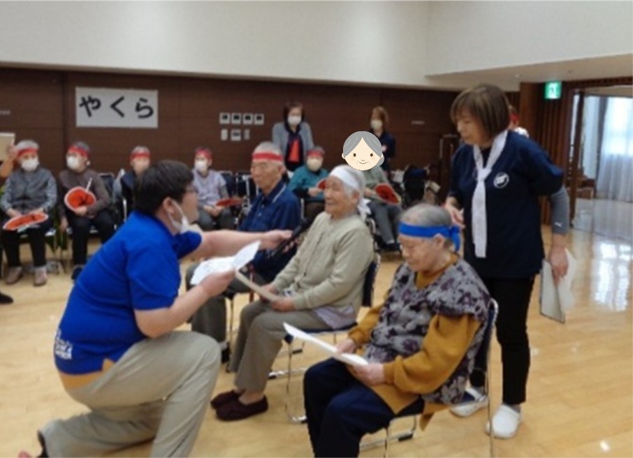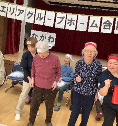 チェリーこども園の園児によるマツケンサンバ。可愛い園児のダンスと曲に合わせて入居者もポンポンを振って応援!!「めんこいな~」とみんな笑顔に♪ また、木村社中による手踊りにも魅せられていました。手踊り名人が2人もおり、華麗かつ力強い踊りを楽しむことができました。