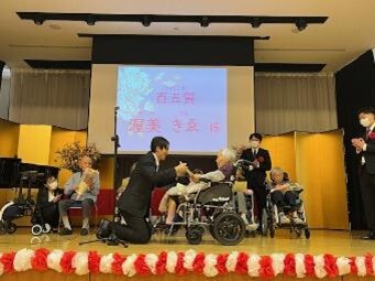 特別養護老人ホームに続き、デイサービスセンターでも敬老会を開催しました。こちらでも表彰が行われ、最年長は104歳のご利用者様でした。