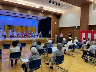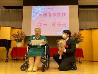 また、職員によるピアノの生演奏で、「ふるさと」を大合唱し、会場中に歌声が響き渡りました。最後には、ご入居者を代表して森田育子様からご挨拶をいただきました。日頃の感謝の気持ちを述べられるとともに、「これからも元気に前向きに暮らしていきたい」という思いを込めたご挨拶に、温かい拍手が鳴りやみませんでした。