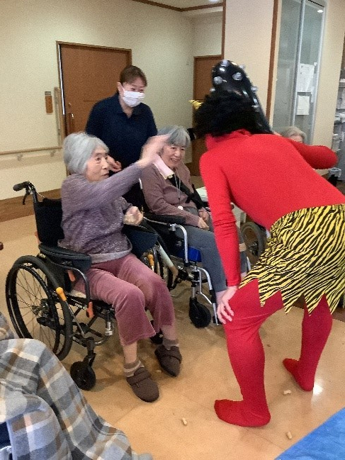 職員が鬼に扮して各ユニットを回ると、皆さまは落花生を手に取り、「鬼は外!福は内!」と元気よく声を上げながら投げてくださいました。