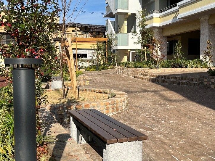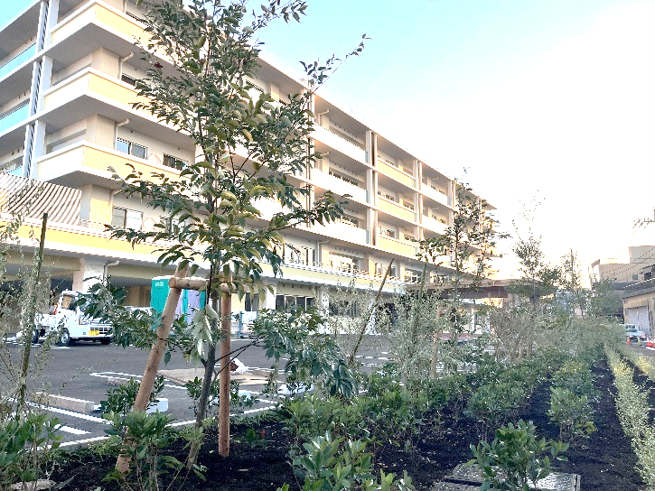 ハピネスもときでは、ご入居者さま・ご家族さま、そして地域の皆さまに心地よい時間を過ごしていただけるよう、敷地内にたくさんの緑を配置しております。
